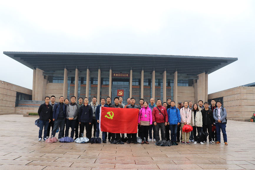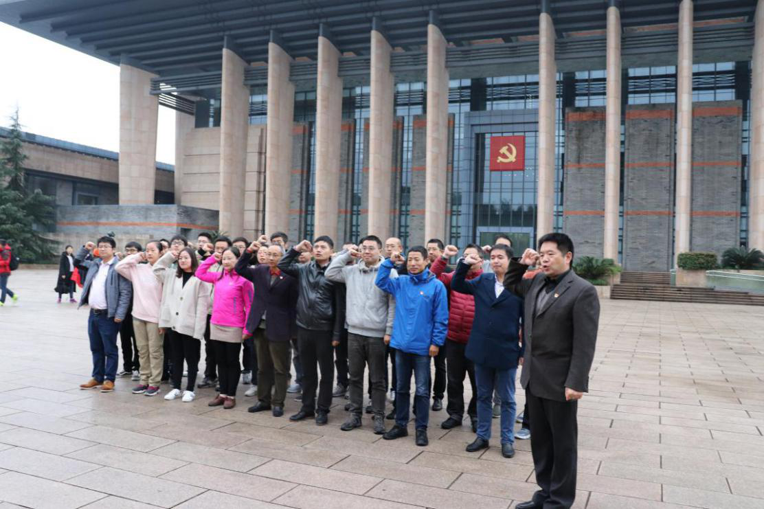 在纪念馆宣誓墙前,在鲜艳的党旗下,全体党员重温了入党誓词,接受了一次难忘的精神洗礼。宣誓墙前,全体党员面对党旗,庄严肃立,高举右手。一句句铿锵有力的誓言发自肺腑,一颗颗忠诚向党的红心澎湃不已。