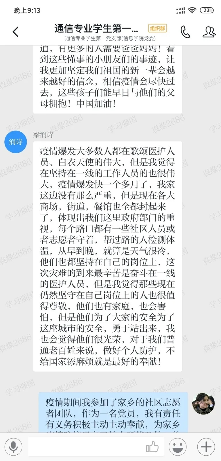 2月20日晚8点,马利国老师和通信专业学生第一党支部全体党员在学习强国平台召开了会议。会议上,马老师首先解读了学校的相关文件政策,跟同学们再次明确了不要提前返校和做好网课上课准备,及时健康打卡做好信息填报。马老师接着对现阶段的浙江省和中国的疫情防控作了概括,希望大家充满信心,向一线医护人员和所有逆行者致敬,做好自己份内事。最后马老师讲了个人感受,一个是中国虽然遭受疫情,但是全国人民团结一致,共克时艰,体现了我党坚强的领导、我国优越的政治制度和团结一心的中华民族精神;每个同学要力所能及做好自己的事情。最后提醒大家做好防护,加强锻炼,提高免疫力。