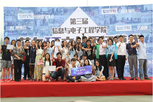 5月28日12:00,信息学院第三届蓝色IT文化季闭幕式在圆形广场隆重举行,校团委副书记李俊、信息学院党总支副书记姜国泉、杭州鸿泉数字设备有限公司总经理助理陈丽莎出席本次闭幕式。活动同时吸引了许多老师、同学驻足观看,现场气氛热烈。
