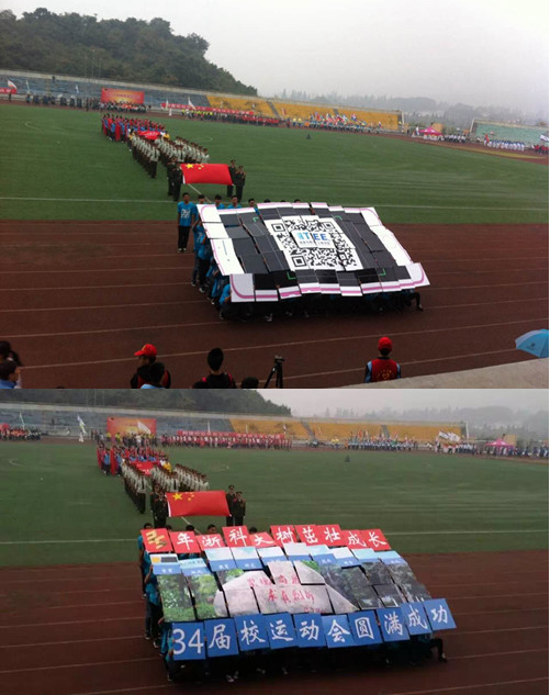 开幕式上,信息学院的学子身穿统一的“itee蓝装”,迈着整齐的步伐,精神饱满。他们用50块KT板在主席台前拼接出了三副在浙江科技学院中信息学院的身影。