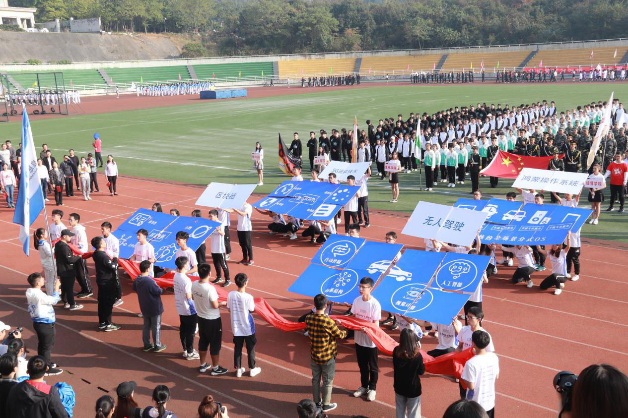 由50名同学组成的方阵队伍,结合信息学院专业特色,融合互联网发展进程,向大家展示了“5G”、“区块链”等前沿科技,巨幅国旗和由学生拼成”70”字样表达了信息学子的爱国情怀。“聚你我能量,燃中国梦想,一颗中国心,共筑中国梦”喊出了信息学子的科技报国的心声。运动会期间,所有选手都赛出了成绩,赛出了风格,发扬了拼搏奋进的精神,看台观众和学生会工作人员也在场下做好加油助威和服务工作。