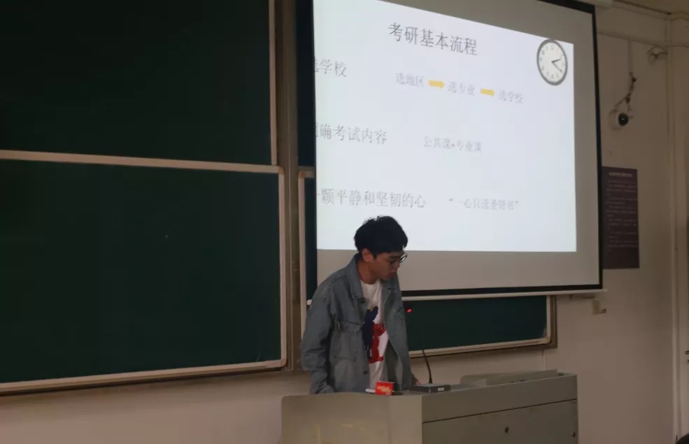 周志鹏学长介绍了考研的基本流程并表示考研需保持一颗平静的心,耐得住寂寞,抵得住诱惑。不要和别人比,和自己比,有野心,但也要量力而行。