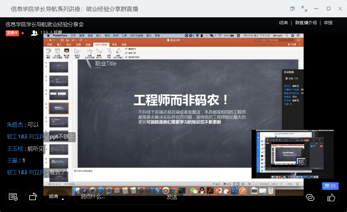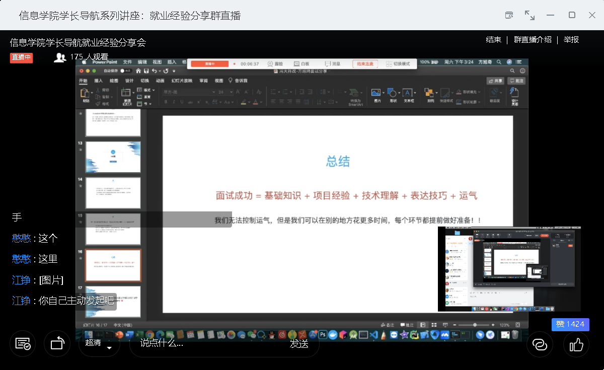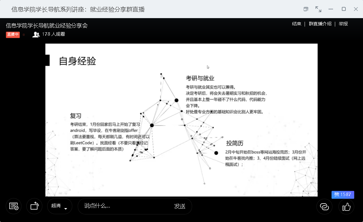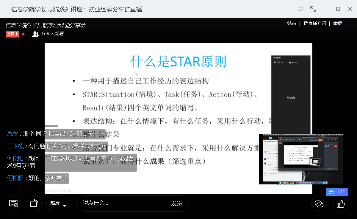 为全面做好2020年就业工作,进一步帮助在校学生更好的确立未来发展目标和方向,为学生就业提供有利的指导和帮助,并结合大三年级学生的实际需求,开云官方版网站登录入口于5月23日下午14点30分举办了线上就业经验分享会。信息学院18级辅导员谢超凡老师,以及各年级同学180余人参加了本次讲座。